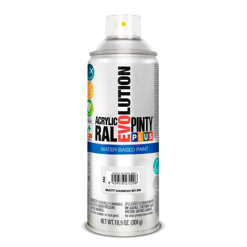 Pinty Plus Water-based spray varnish, clear colorless and fast drying for arts and crafts. Applications of the water-based varnish This new formulation is suitable for indoors. Protects, enhances and waterproofs any surface such as drywall, plaster, marble, wood, resin, wicker, cork,...