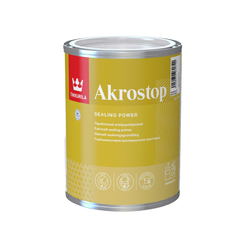 Single pack, water-based, stain blocker suitable for use on both new and previously painted concrete, plaster, brick, putty, fibreboard, plasterboard, wood, panel and log surfaces. Prevents bleeding caused by nicotine, soot, liquid drawing ink and hides dried water damage. Akrostop...