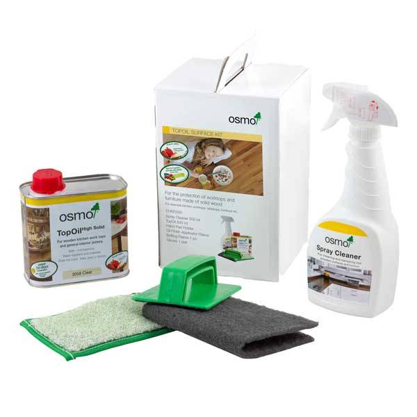 KIT CONTAINS THE FOLLOWING: x1 500ml TopOil 3058 (Clear Matt) x1 500ml Spray Cleaner (8026) x1 Hand Pad Holder x1 Oil Finish Application Fleece x1 Abrasive Pad x1 Pair of Gloves SURFACE PREPARATION Wood surface must be clean, dry and...