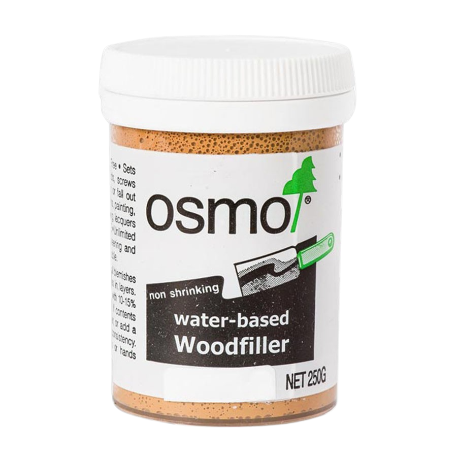 The grain of a tree is a unique fingerprint of nature: The even and beautiful surfaces of Osmo Woodfiller preserve this individual character. Osmo Woodfiller is a non-acryllic and water-based multi-purpose edge-filler, wood putty, crack filler and sanding sealer all in one. Unlike most woodfillers, it can easily be sanded at any time after drying, and it’s fast drying -within approx. 30 minutes on very thin applications. Non-flammable and non-toxic, heat and freeze-proof, will not crack, shrink, sink or fall out.Osmo Interior Ready Mixed Wood Fillers 250g