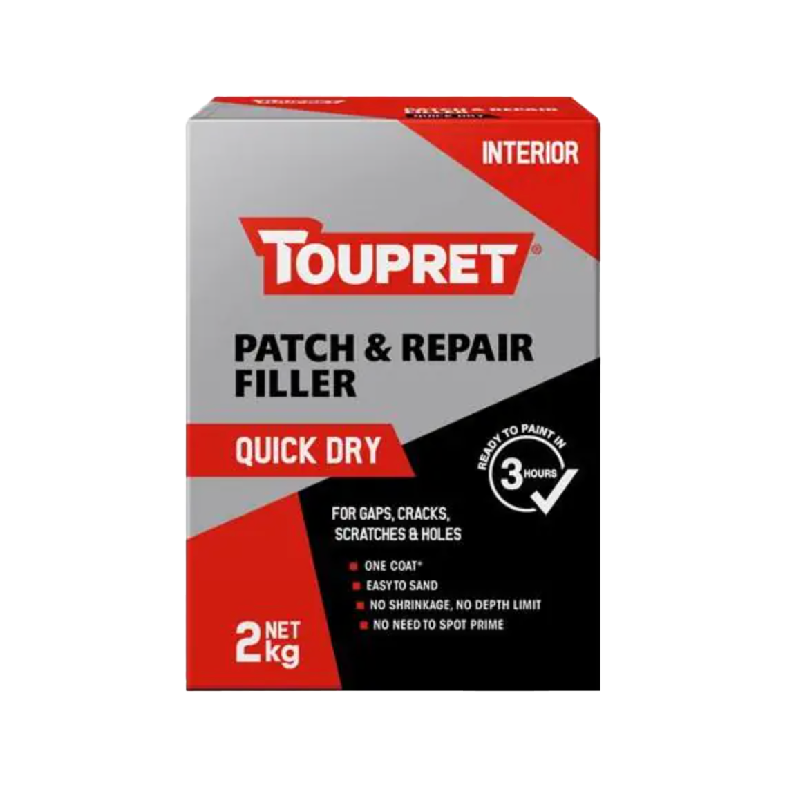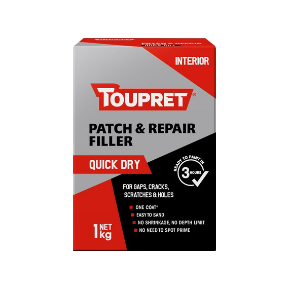 TOUPRET Patch & Repair Quick Dry filler is suitable for gaps, cracks, scratches and holes on interior surfaces. Ready to overpaint in just 3 hours. Easy to sand, with no shrinkage, no depth limit and no need to spot prime.