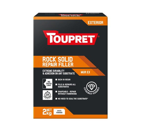 EXTERIOR ROCK SOLID REPAIR FILLER is extremely durable and will adhere to any substrate for filling and repairs with no depth limit. It sets to a rock hard finish and can be overcoated in 24 hours. Overcoat with any standard water-based masonry paint or mineral paint. If using polyurethane or epoxy solvent-based paints, first prime with a water-based exterior paint.